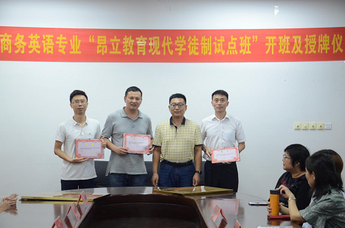 9月17日下午,学校在实训楼南310举办了商务英语专业“昂立教育现代学徒制”试点班授牌暨开班仪式。学校副院长高创宽,语言系主任杨成青,杭州昂力文化科技有限公司总经理、杭州领先文化创意有限公司总经理孙强,杭州昂立教育石桥学校校长胡志强,杭州昂立教育萧山学校校长戚伟慧,昂立教育瓶窑校区教务长钱静,昂立教育石桥校区教务长田晓芳,部分商务英语专业老师以及18级和19级的学生代表出席仪式。