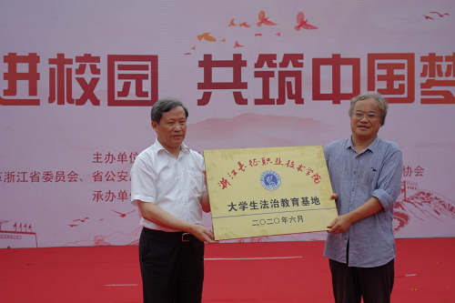 启动仪式上,在我校学子献上精彩的歌舞表演后,省政协副主席孙景淼为浙江长征职业技术学院与浙江厚启律师事务所、盈科杭州律师事务所开展校所共建“大学生法治教育基地”授牌。我校普法宣传志愿队的学生代表们上台接受授旗、赠书。现场还举行了“法治进校园 共筑中国梦”志愿承诺签名活动,同学们纷纷签名,承诺做新时代的守法大学生。