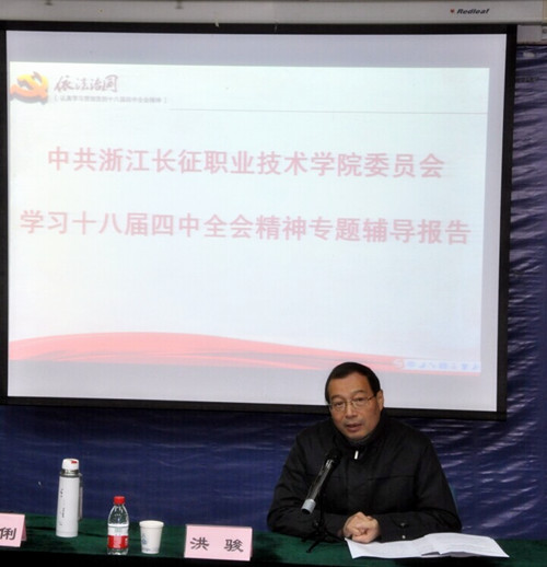 12月3日下午,中共浙江长征职业技术学院委员会学习贯彻十八届四中全会精神专题辅导会在1号楼1117室准时召开。学院领导和全体教职工党员参加了此次专题辅导会。学院思想政治理论教学部孙伶俐老师应邀作题为《全面推进 依法治国》的专题报告。