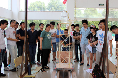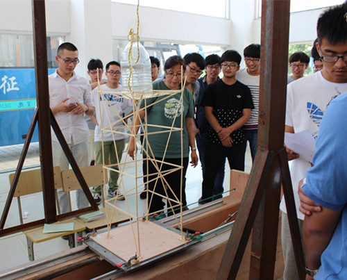 比赛分为两个环节,首先是称量模型的重量,再到测试模型在承重情况下的坚固性能。比赛的测试坚固性能是最扣人心弦的环节。第一个参赛模型因根基不稳而倒塌。这让很多参赛队员心里忐忑不安了,同时也带来了压力。接下来的测固过程中,每个团队都拿出自己的建筑模型。有的模型过于单薄,在水桶放上去的时候就承受不住压力而倒塌。也有的侧重于模型根基,导致上部不稳而破坏。可以看出这一定程度上提高了比赛难度。比赛中最厉害的一个模型成功的承受了重量和震动仪的晃动。在几次实验中模型都不曾损坏,同学们惊叹之余给予了热烈的掌声与欢呼。赛后,陈老师也耐心的给参赛团队讲解失败之处,为同学们点迷津,解疑惑,树信心。
