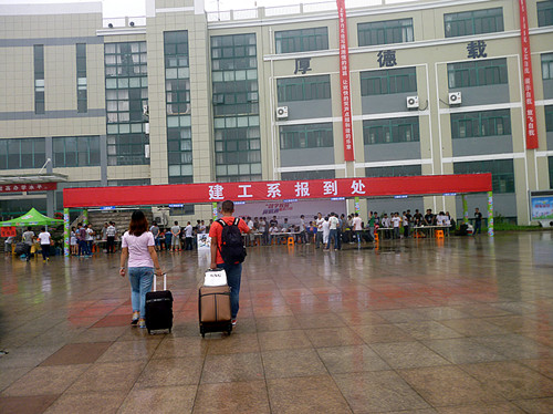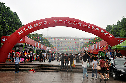 “笑脸喜迎新同学,热情拥抱新伙伴”。2013年9月12日,浙江长征职业技术学院13级新生从全国各地陆续到校报到。团委、学生会、社联及各系学生会干部共同参与到此次迎新活动中。图书馆前的各系报到处,热火朝天地忙着新生的接待注册。虽然下着小雨,迎新志愿者们却丝毫不减热情,不辞辛苦地往返于学院正门、行政楼、寝室三处搬送行李,并全程协助新生和家长办理报到手续。