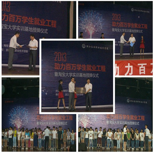 在仪式上,阿里巴巴集团为我院进行了实训基地授牌,在我院正式成立“淘宝大学实训基地”,标志着2013年淘宝大学“助力百万学生就业工程”校园行正式在全国启动。同时,来自电商企业的各位领导为我院315名学生颁发了淘宝平台操作基础技能认证证书。阿里巴巴淘宝大学实训基地将根据企业人才需求,开设电子商务人才专项技能培训班,为企业输送专业人才。