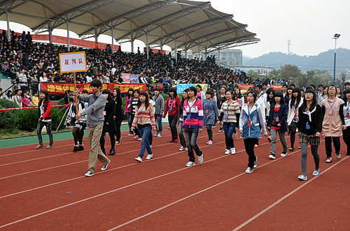 运动会开幕式在国旗护卫队和彩旗队入场式中拉开帷幕,裁判队和学院行政教职工及各系运动员代表队依次入场。