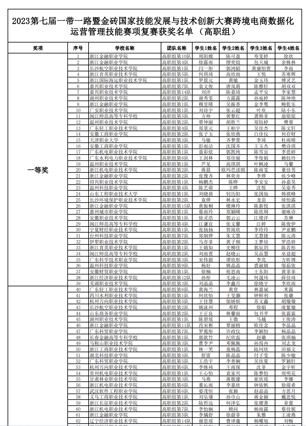 近日,2023年第七届“一带一路”暨金砖国家技能发展与技术创新大赛首届跨境电商数据化运营管理技能赛项(高职组)落下帷幕,学校2022级国际贸易与经济专业的章蕾、张熠菁、陆哲远、何泽弘四位同学组成的参赛队伍(指导教师:潘冬梅、徐雅琴)从参赛的574支参赛队伍中脱颖而出,成功获得二等奖。