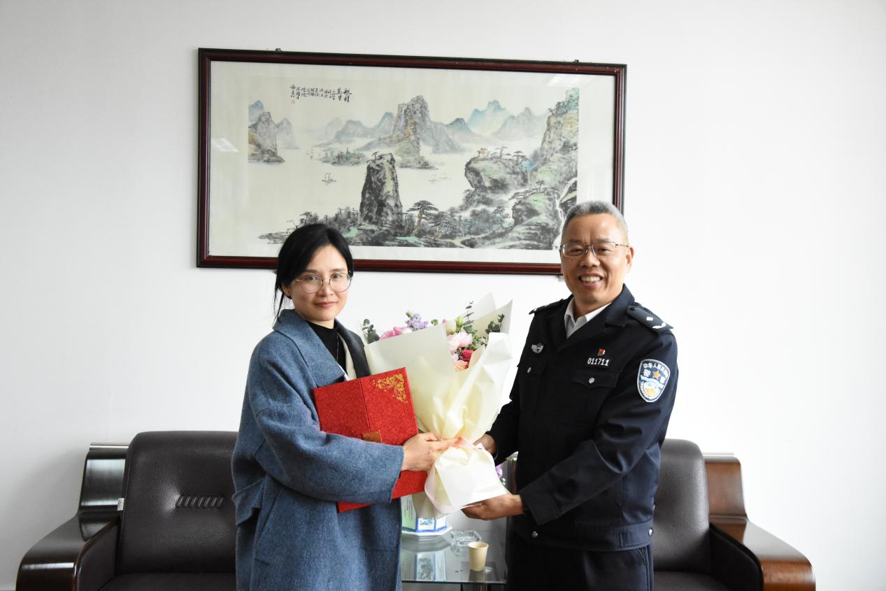 3月6日,杭州市公安局交通警察支队党委委员、纪委书记孟涛,杭州市公安局交通警察支队上城大队教导员刘祖辉一行来我校为财务与会计学院辅导员陆海燕颁发“优秀警嫂”荣誉证书。学校党委副书记吴有恩、保卫处处长陈建云、财务与会计学院党总支书记李晓梅等出席了授奖仪式。