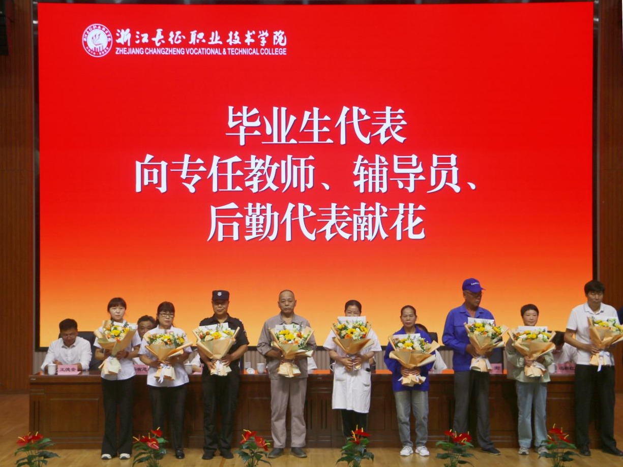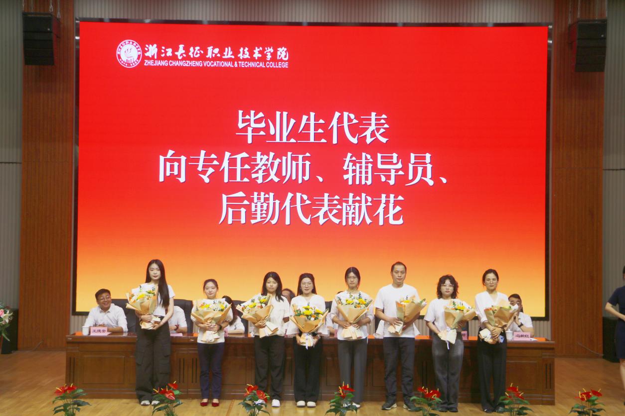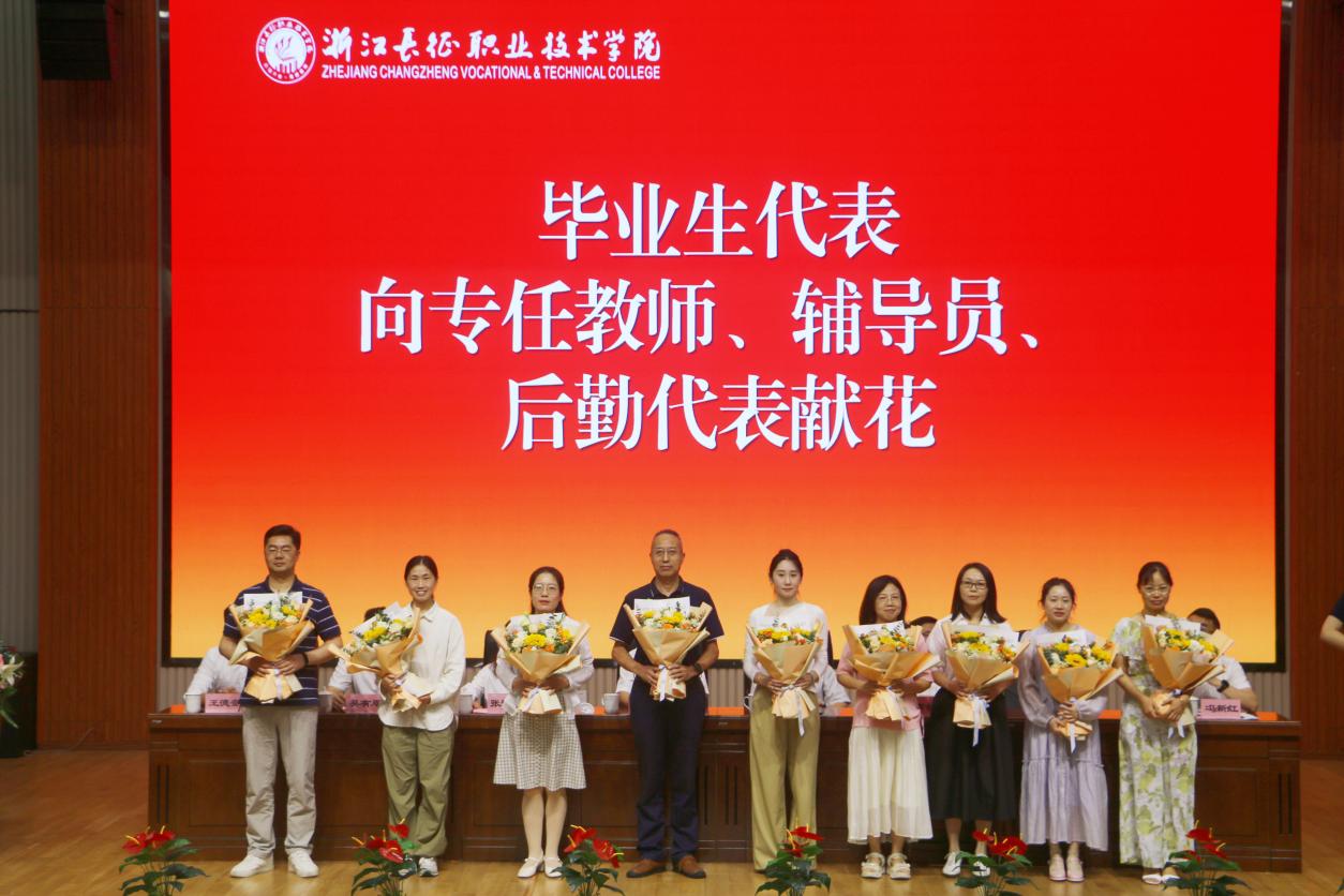 学生的成长离不开学校各个岗位的老师的关心和关爱,典礼上,学生代表向三年来,辛勤教导、服务他们的任课教师、辅导员、后勤工作人员代表献花,感谢他们无私付出和默默守护。
