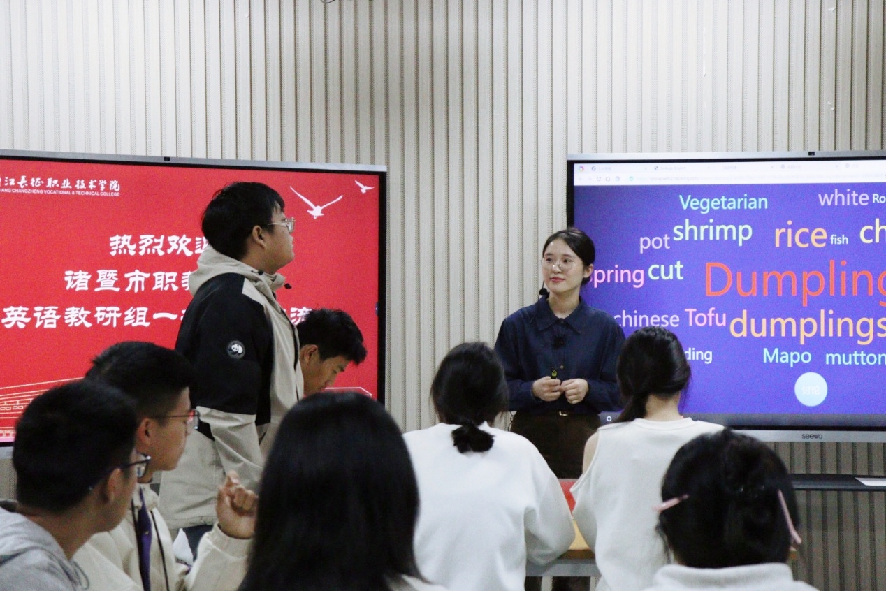课堂观摩环节,公共外语教研室张燕婷老师以“Chinese Cuisine(中国饮食文化)”为主题,呈现了一堂生动的《大学英语》示范课。课上,她巧妙运用图片、视频、游戏PK与小组协作任务等多种方式,激发学生参与热情,引导学生在掌握中国饮食文化相关英语表达的同时,提升口语应用与跨文化沟通能力。观摩课上活跃的课堂气氛、AI等现代化教学手段的融合应用,获得了来访教师的一致好评。