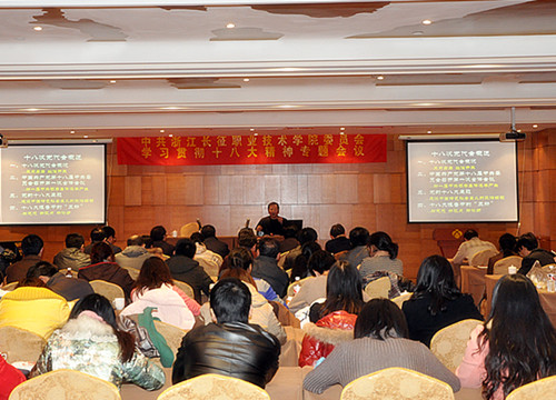 根据党委2012年度党建工作计划,学院党委于2012年11月30日至12月1日在余姚召开“学习贯彻党的十八大精神专题会议”专题党员大会。学院全体院领导及近百名教职工党员参加了大会。会议由党委副书记王其军主持,会上基础部朱泽中教授作了题为《十八大报告解读》的专题报告。